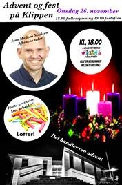 Kl. 18.00 Spising. Kl. 19.00 Festaftenen. Jens Medom: "Det handler om advent". Lovsang, kaffe & lotteri