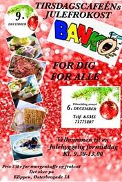 Tirsdagscafeen indbyder til kaffe, lækker julefrokost, og banko. Timelding 71771807. Pris 75 kr for hele pakken